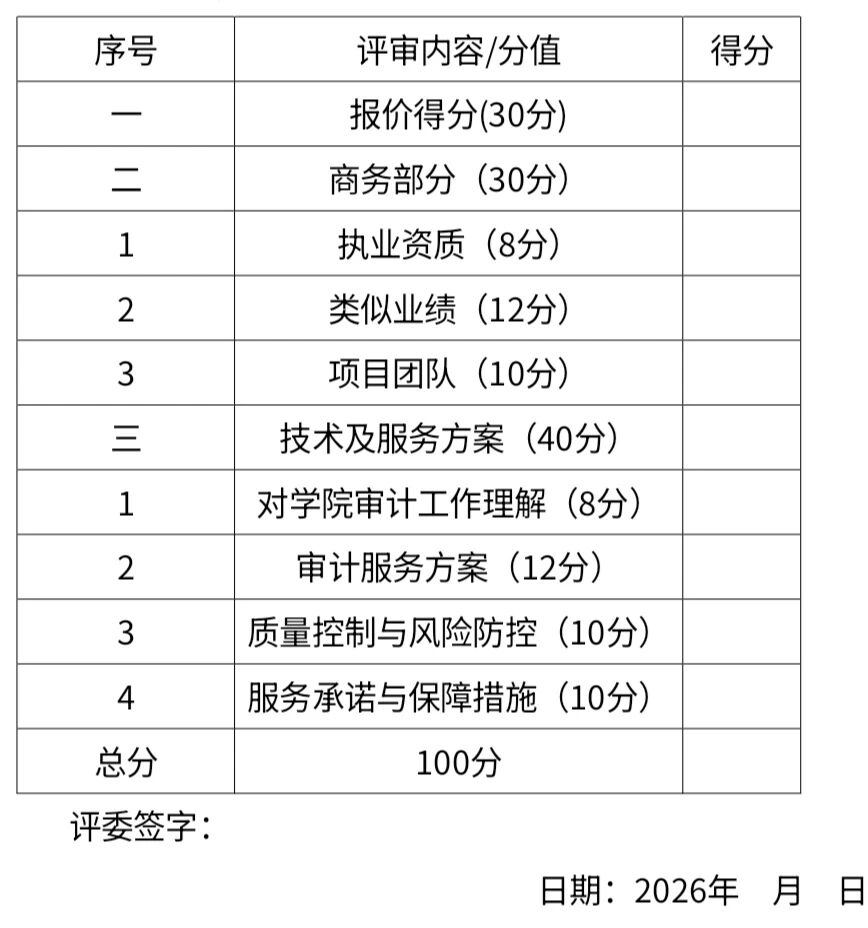 2. 服务内容:财务收支审计、专项资金审计、内部控制评价、竣工财务决算审核及学院委托的其他审计事项。