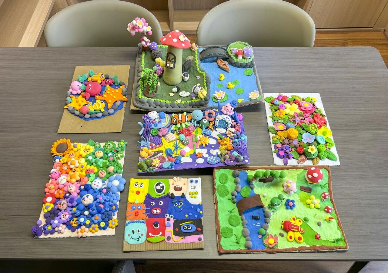 经过精心创作,一件件创意十足、色彩斑斓的粘土作品精彩亮相。立体蘑菇屋搭配灵动小生物,仿佛藏着童话秘密;海洋主题作品里,小鱼、珊瑚、海星栩栩如生,充满生机;卡通形象憨态可掬,花海作品色彩明艳,每一处细节都彰显着同学们的用心与创意。