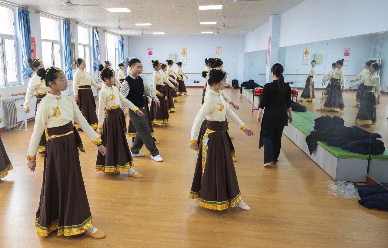 课堂上,专业教师先以芭蕾基训中的“擦地训练”为起点,从脚位精准度、腿部延伸感到手眼协调配合,逐一纠正学生动作细节,帮助学生们夯实芭蕾“开、绷、直、立”的核心基础,筑牢舞蹈表演专业的“基本功底盘”。随后,课程转入藏族舞蹈元素学习,通过分解踢踏、弦子等经典动作的发力方式与风格特点,引导学生感受藏族舞蹈的豪迈与灵动,在节奏与肢体的配合中,领悟民族舞蹈的文化内涵。