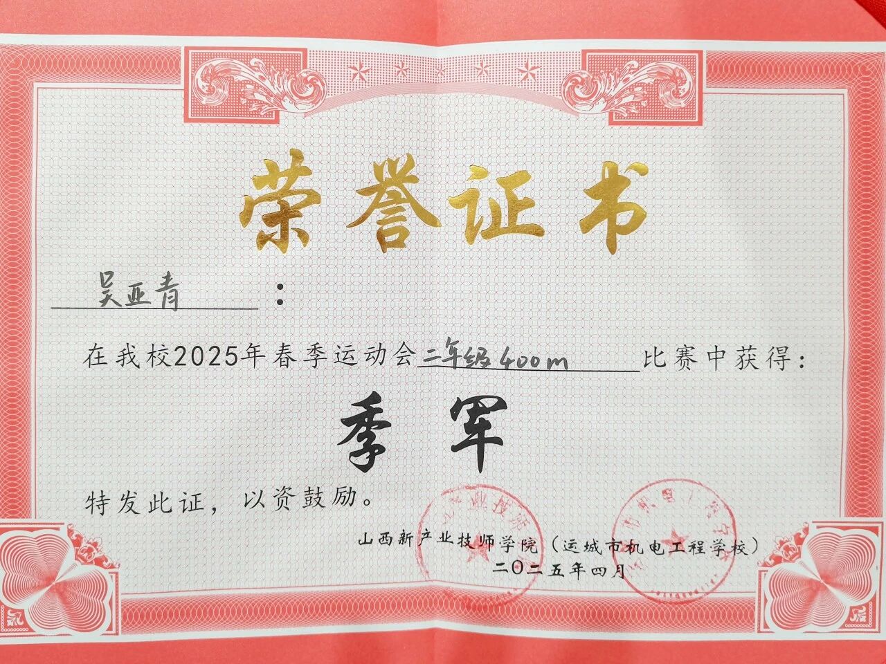 除了专注学业,吴亚青也在多个方面努力提升自己,积极为集体贡献力量。军训期间,她严守纪律,认真训练,态度严谨,作风扎实,获评“军训标兵”,用实际行动诠释了集体意识和责任担当;运动会上,她奋勇拼搏,全力冲刺,拿下女子800米第二名、400米第三名的成绩,既锤炼了坚韧意志,也为班级争得了荣誉。