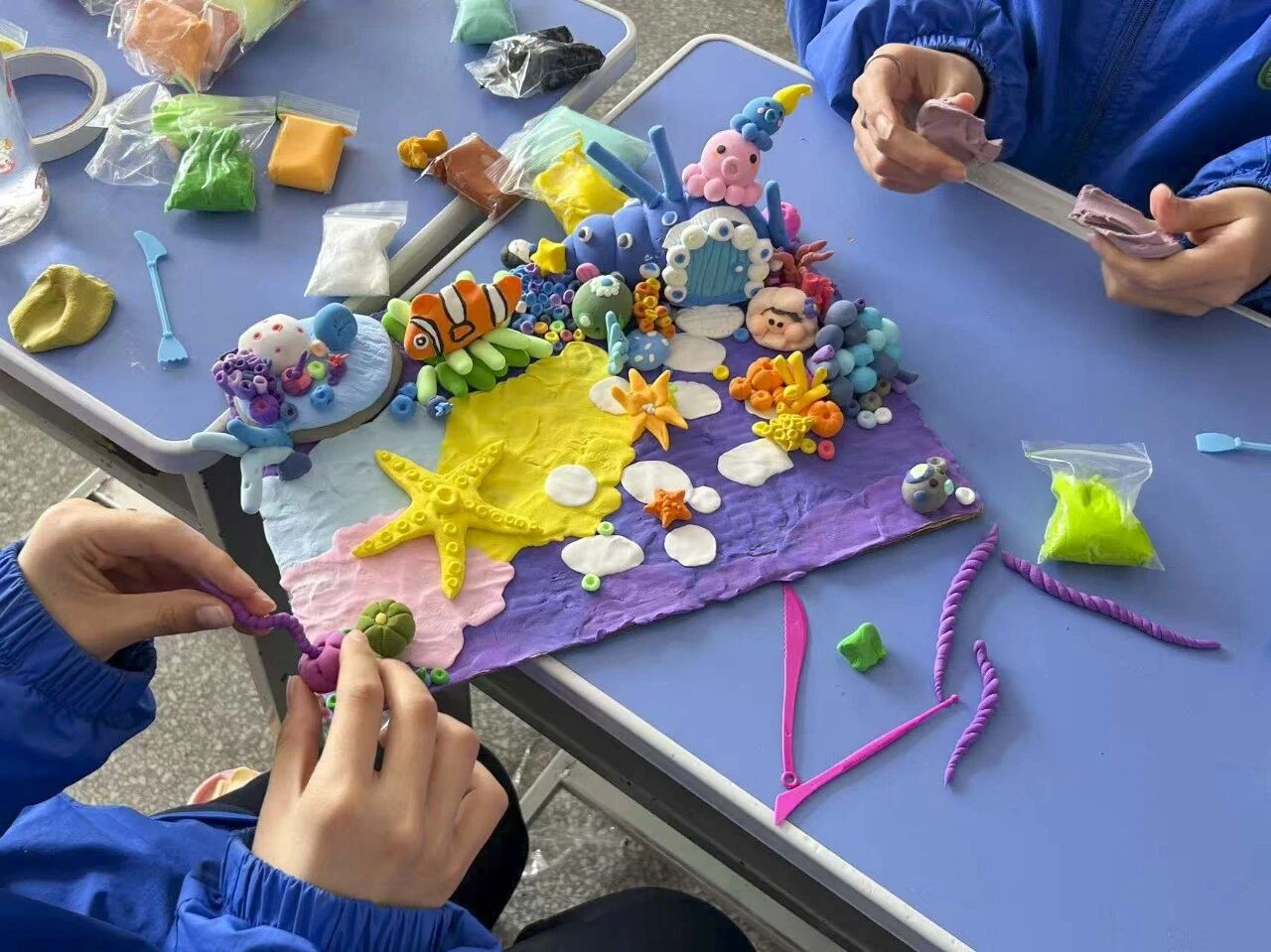 活动现场,专业教师细致讲解超轻粘土的特性、塑形技巧与创作思路,从基础揉、捏、压、搓手法,到场景搭建、色彩搭配,耐心示范指导。同学们热情高涨,充分发挥想象力,专注投入创作过程。指尖翻飞间,粘土在手中变幻出多样形态——缤纷的海底世界、奇幻的森林秘境、可爱的卡通形象、绚烂的花海图景,每一件作品都凝聚着同学们的巧思与匠心,尽显童真童趣与艺术灵气。