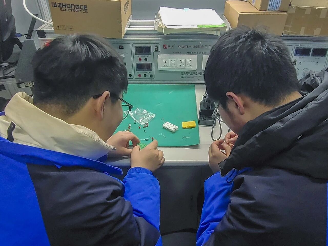 相较于初入校园时的懵懂,经过一学期的学习积累,高一新生已具备基本的专业认知基础。此次活动精准衔接学段学习需求,学长们提前打磨技能,从声控旋律灯套件的元件识别、电路板布局,到焊接手法,总结出一套适合新生的入门技巧。活动现场,学长们俯身耐心指导,手把手纠正新生握烙铁的姿势,细致讲解焊点圆润饱满的秘诀,逐一解答元件参数、电路连接等疑问;新生们专注聆听、认真实操,从最初的小心翼翼试探,到逐渐掌握焊接节奏,指尖的每一次起落,都是技能的成长与蜕变。