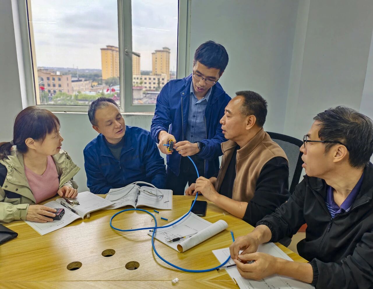 互动实践环节成为本次教研的亮点。教师们以小组为单位动手实操,从最初的线序混淆,到逐步熟练完成整个制作流程。杜晓辉老师巡回指导,针对每位教师的操作误区逐一纠正。当各组制作的网线通过测试仪显示“全通”时,现场讨论氛围愈发热烈——教师们不仅分享着实操成功的经验,碰撞出跨学科教学创新的火花。