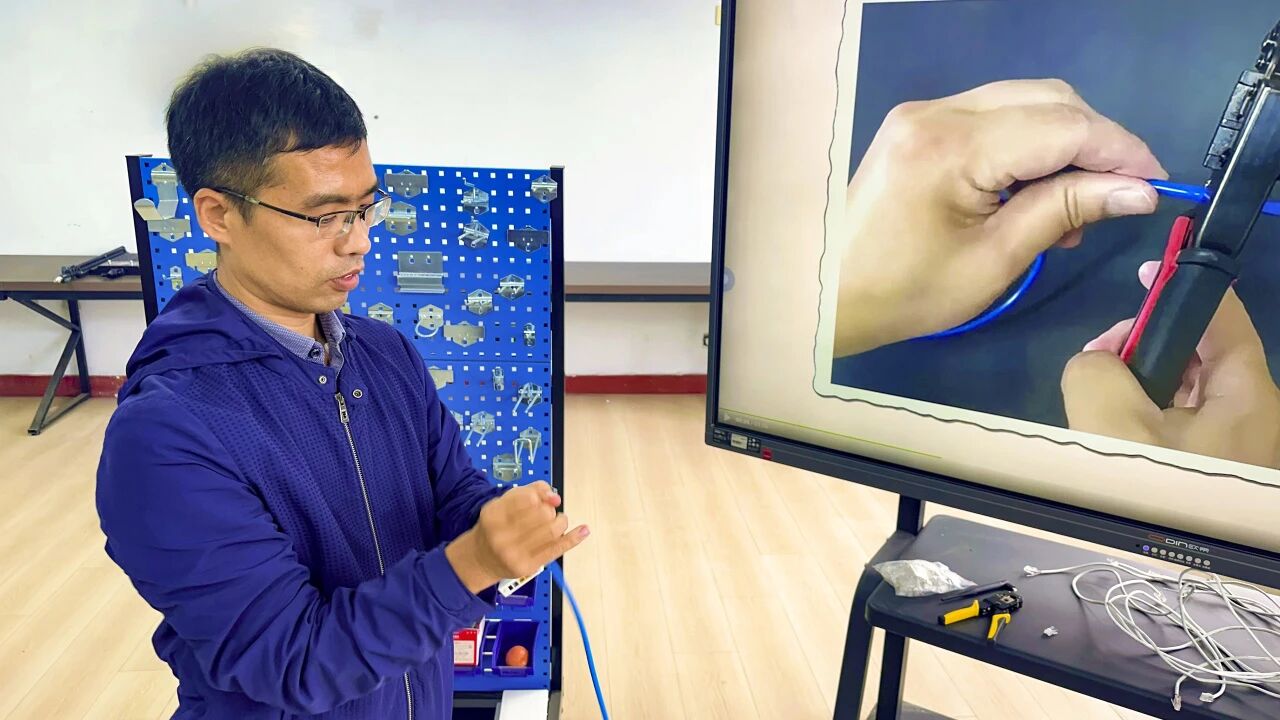 活动中,杜晓辉老师紧扣工学一体化教学理念,将“网线制作”这一基础且实用的技能,拆解为“理论精讲—示范实操—分组实践—答疑复盘”四个环节。他结合小型局域网搭建的真实应用场景,从网线线序标准的区别、水晶头压接的关键步骤,到网线通断测试的操作方法,均进行了细致讲解。为让参与教师直观掌握要点,杜老师现场演示了剥线、理线、插线、压接的完整流程,尤其强调了“避免线缆绞距过大影响传输”“水晶头金属片需完全压实”等实操细节,精准破解了技能教学中的常见痛点。