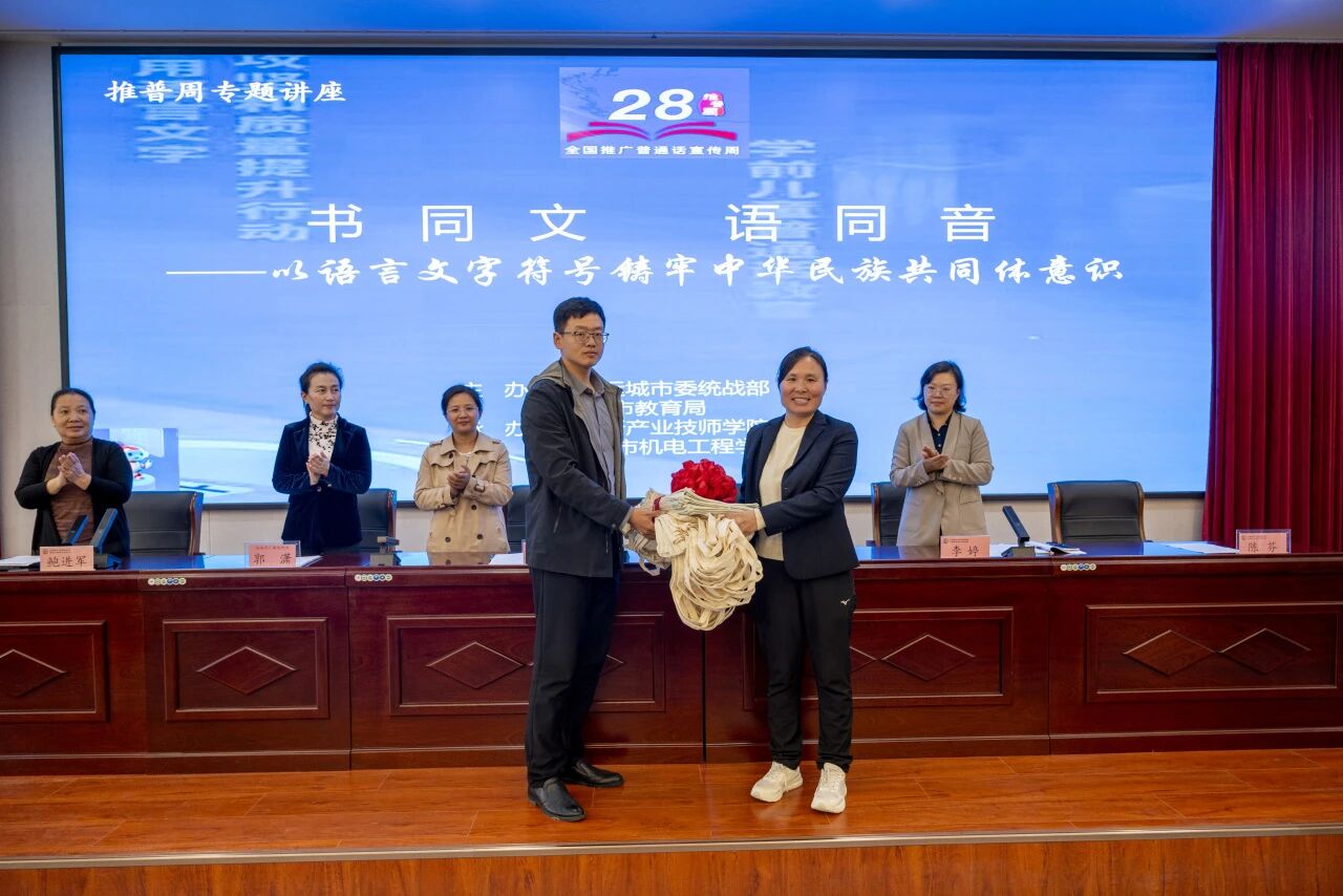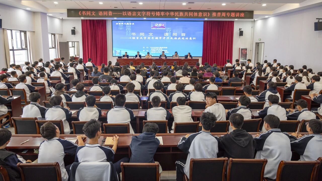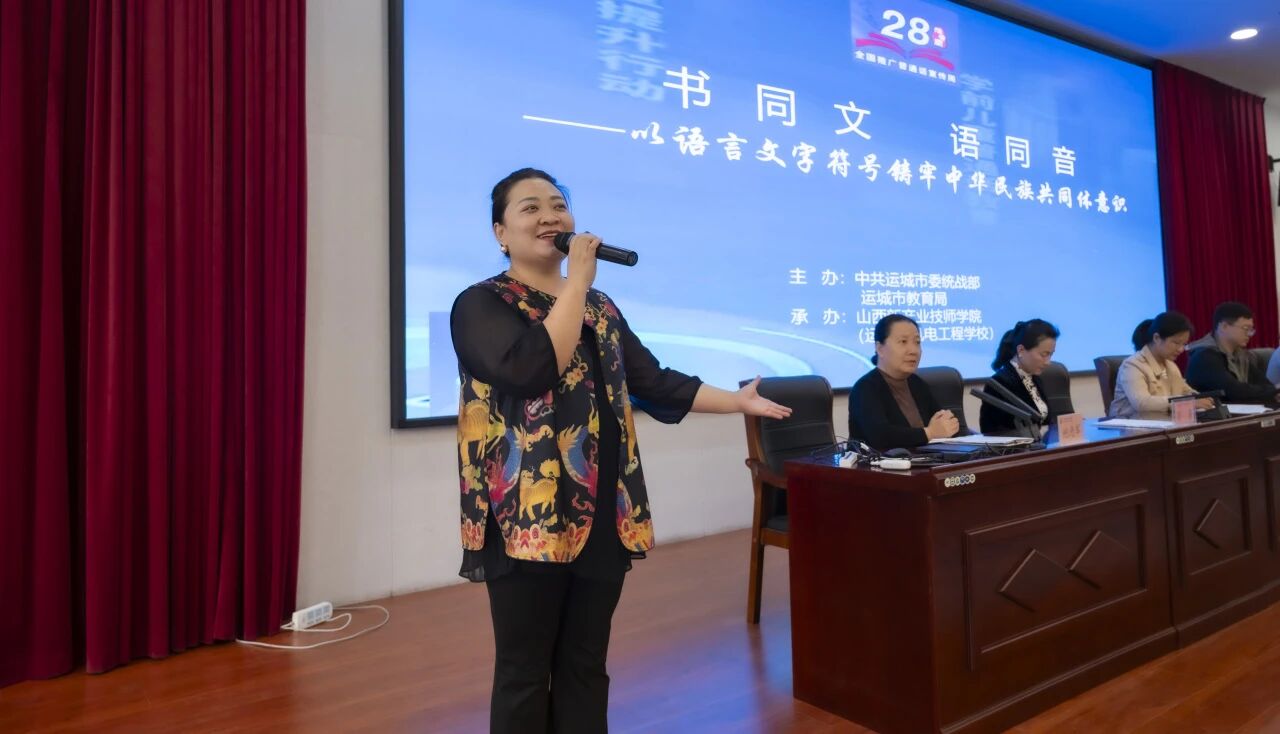 值此第28届全国推广普通话宣传周之际,2025年9月22日下午3时,由中共运城市委统战部、运城市教育局主办,我院承办的《书同文 语同音——以语言文字符号铸牢中华民族共同体意识》专题讲座在公共实训基地七楼会议室成功举办。中共运城市委统战部民族科郭少华、运城市教育局师训科科长雷晋芳、运城市广播电视台主持人郭潇,我院党委委员、副院长李婷,党委委员鲍进军,语委办、公共基础部、现代服务系全体老师及学生积极参与。讲座由鲍进军主持。