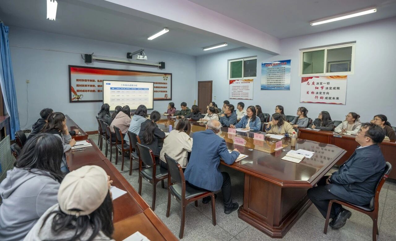 对口高考部副主任洪金科对此次月考成绩进行总分析,指出教学中需要重点关注的知识落实、难点突破等问题。桑燕、裴建玲、王蓓蓓三位教师分别对语数英三科成绩进行单项分析,并提出具体的改进措施和教学策略。
