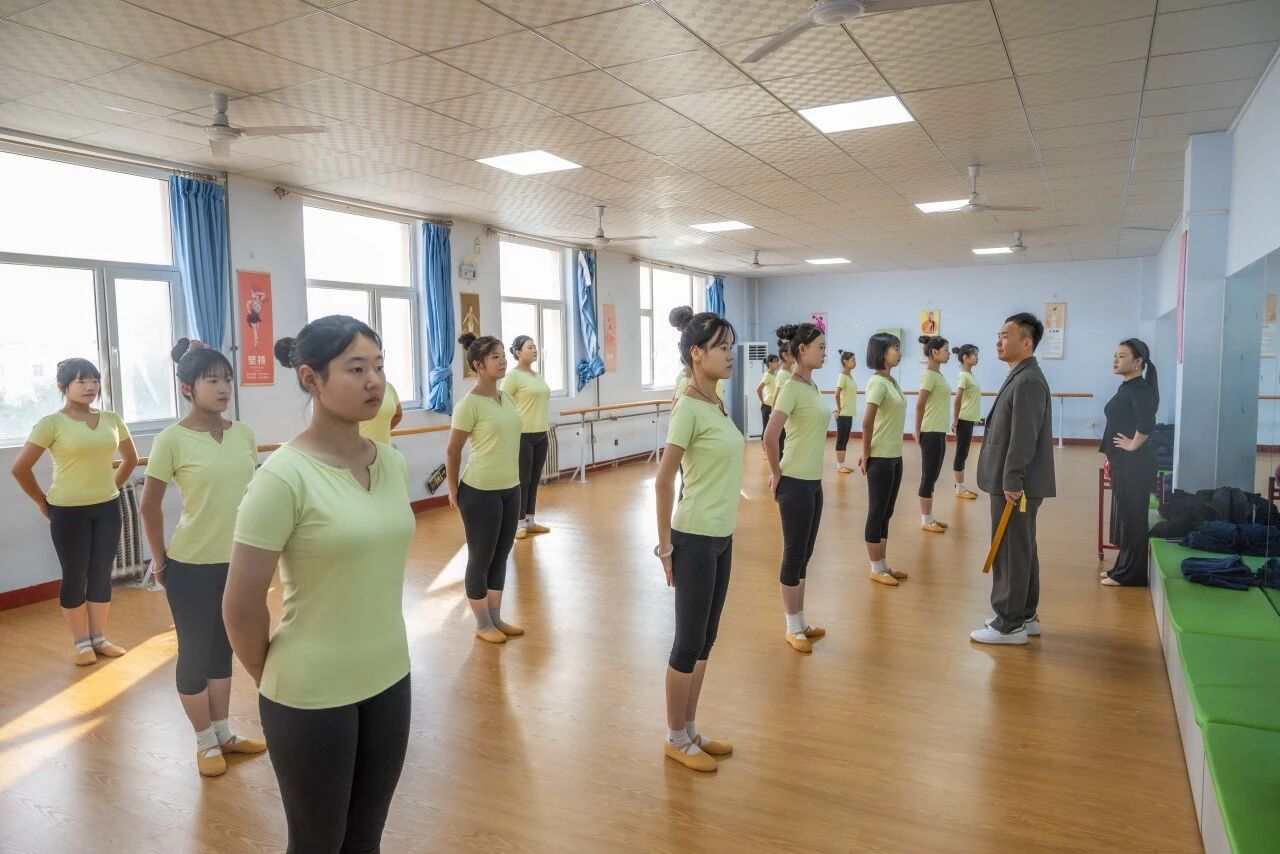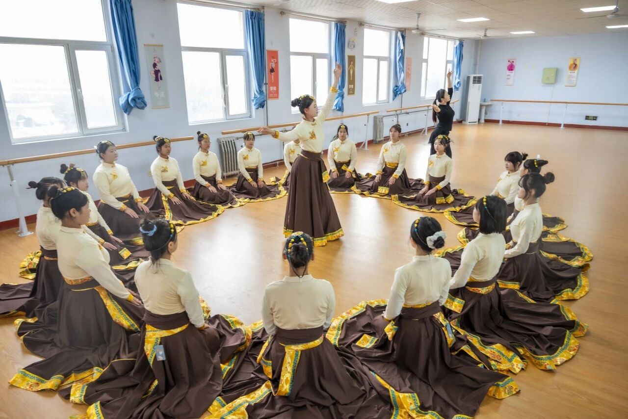 课堂上,专业教师先以芭蕾基训中的“擦地训练”为起点,从脚位精准度、腿部延伸感到手眼协调配合,逐一纠正学生动作细节,帮助学生们夯实芭蕾“开、绷、直、立”的核心基础,筑牢舞蹈表演专业的“基本功底盘”。随后,课程转入藏族舞蹈元素学习,通过分解踢踏、弦子等经典动作的发力方式与风格特点,引导学生感受藏族舞蹈的豪迈与灵动,在节奏与肢体的配合中,领悟民族舞蹈的文化内涵。