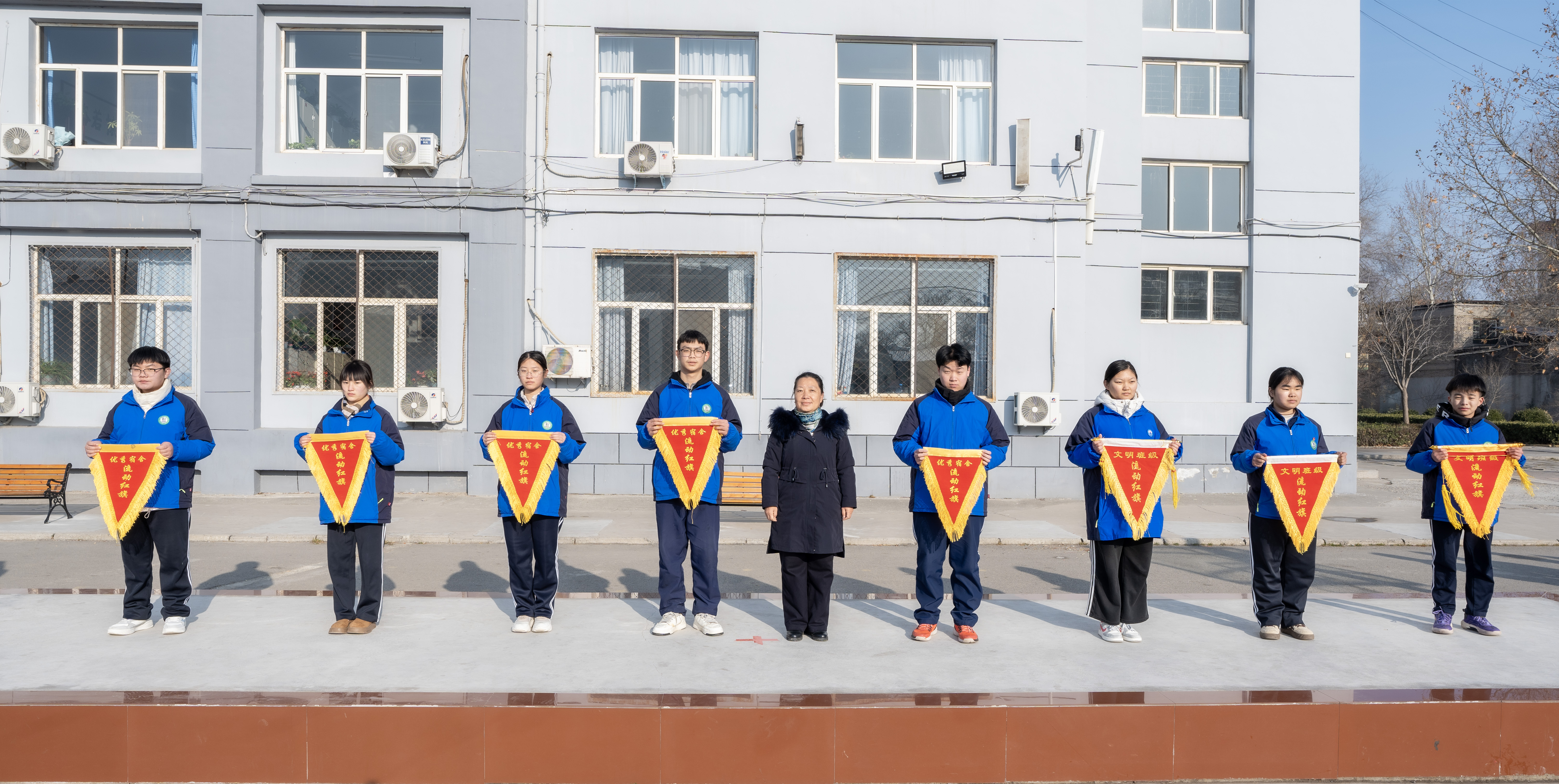 伴随着激昂的出旗乐曲,护旗手迈着铿锵有力的步伐,护送国旗入场。全体师生肃立注目,行注目礼,嘹亮的国歌响彻校园,五星红旗冉冉升起,点燃了每个人心中的爱国热忱。随后,校旗与对口2511班班旗同步升起,校歌旋律悠扬,彰显着山新院的精神底蕴与班级的昂扬风貌。